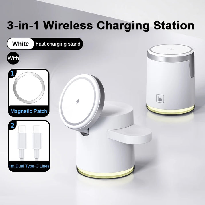 Upgrade your charging game with a sleek 3-in-1 station that keeps your iPhone, Apple Watch, and AirPods organized and powered. Experience the perfect blend of style and functionality at home or on the go.